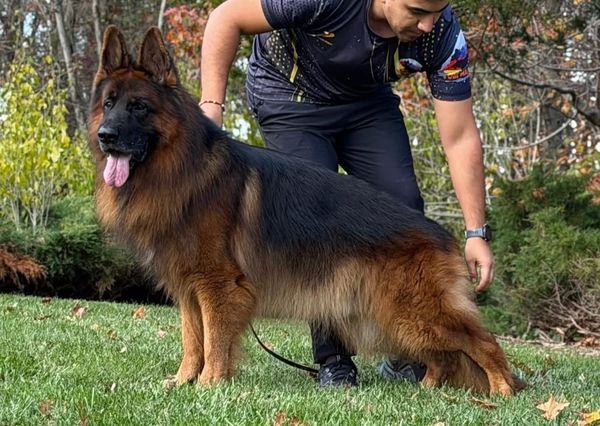 Jovi is an exceptional West German Show Line male known for his powerful structure, balanced temperament, and impressive working ability. Earning multiple V1 ratings over his show career, along with his BH and IGP3 titles and Körklasse (KKL) breed survey, Jovi represents the complete German Shepherd Dog.