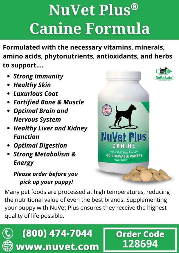 At Vom Schön Traumhund, we start all of our puppies on NuVet Plus before they go home. We've seen firsthand how it helps them thrive, and we recommend that families continue this routine to give their puppies the best foundation for a long healthy life.